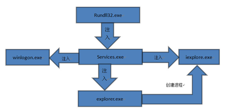 此次瑞星公司公布的病毒分析報(bào)告顯示,“超級(jí)火焰”病毒的主體為一個(gè)名為MSSECMGR.OCX的DLL動(dòng)態(tài)庫(kù),通過命令行“rundll32.exe MSSECMGR.OCX, DDEnumCallback”來實(shí)現(xiàn)病毒的加載。病毒運(yùn)行后會(huì)將自身復(fù)制到System32目錄下,并向services.exe、winlogon.exe、explorer.exe和iexplore.exe等程序中注入自身并實(shí)現(xiàn)加載。該病毒的注入流程如下圖所示。