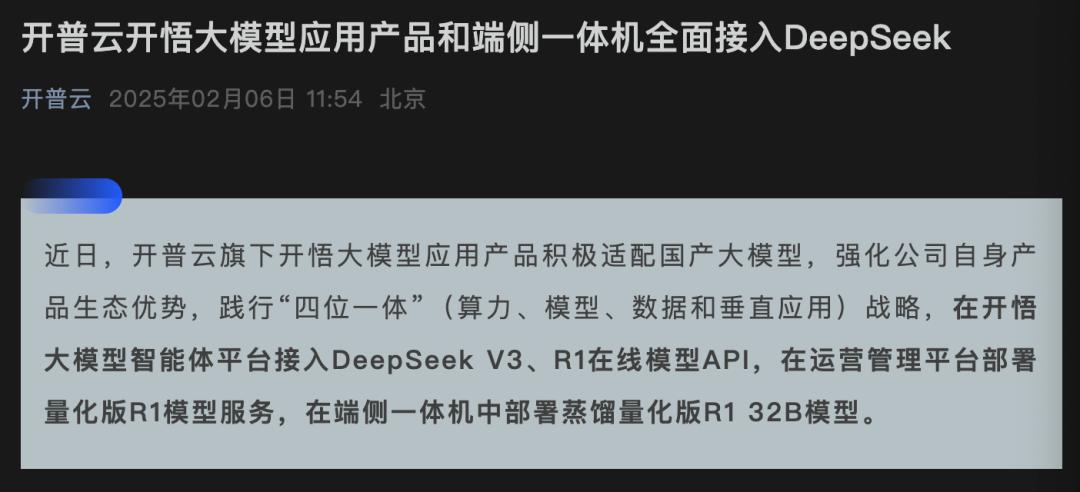開普云則宣布在開悟大模型智能體平臺接入DeepSeek V3、R1在線模型API,在運(yùn)營管理平臺部署量化版R1模型服務(wù),在端側(cè)一體機(jī)中部署蒸餾量化版R1 32B模型。
