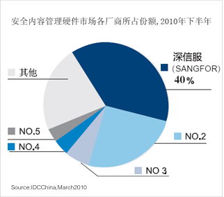 深信服科技在IDC中國發(fā)布的2009年下半年中國安全內容管理市場(上網(wǎng)行為管理市場)報告中占有率達到33.8%,超出第二位廠商達一倍多。